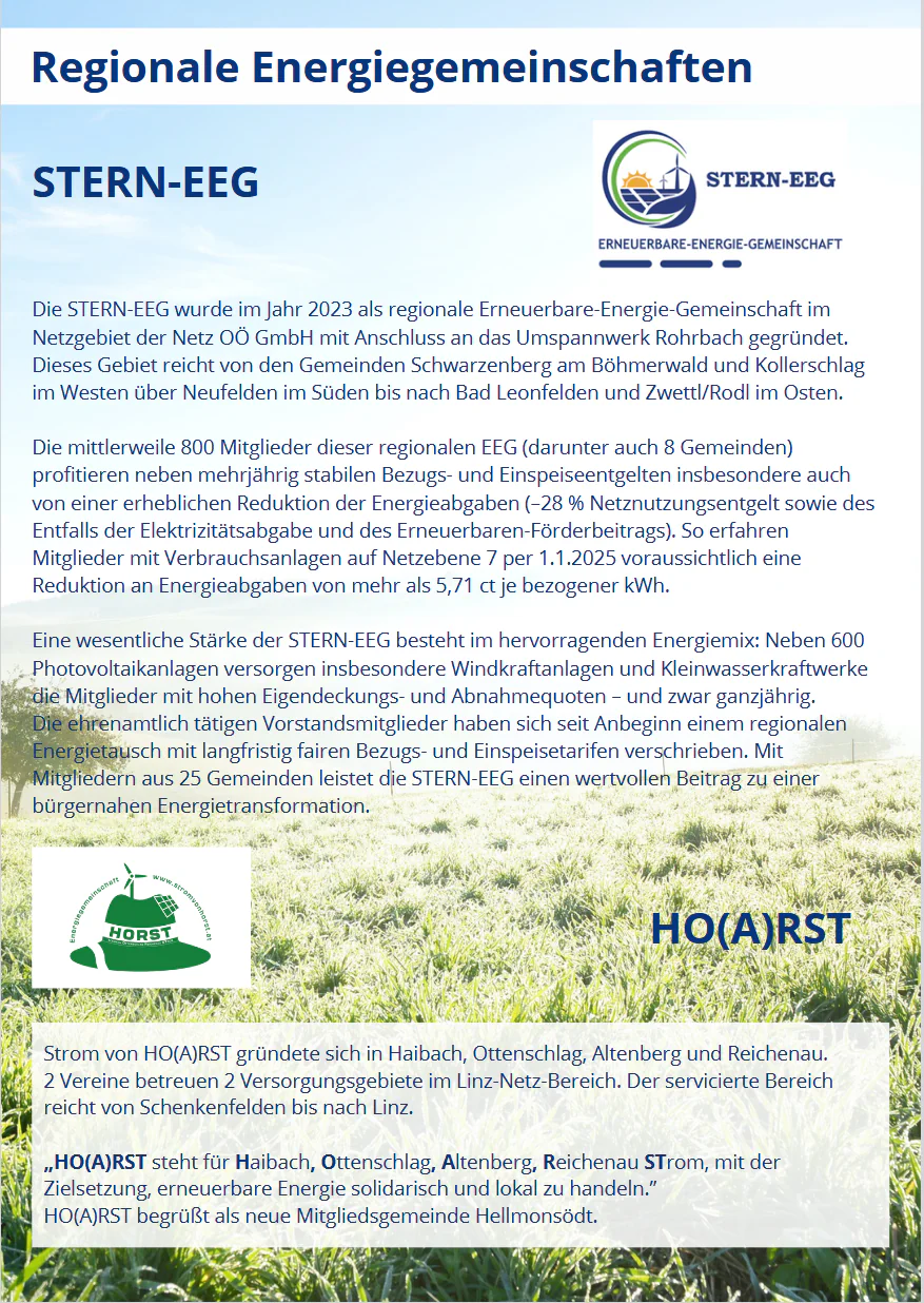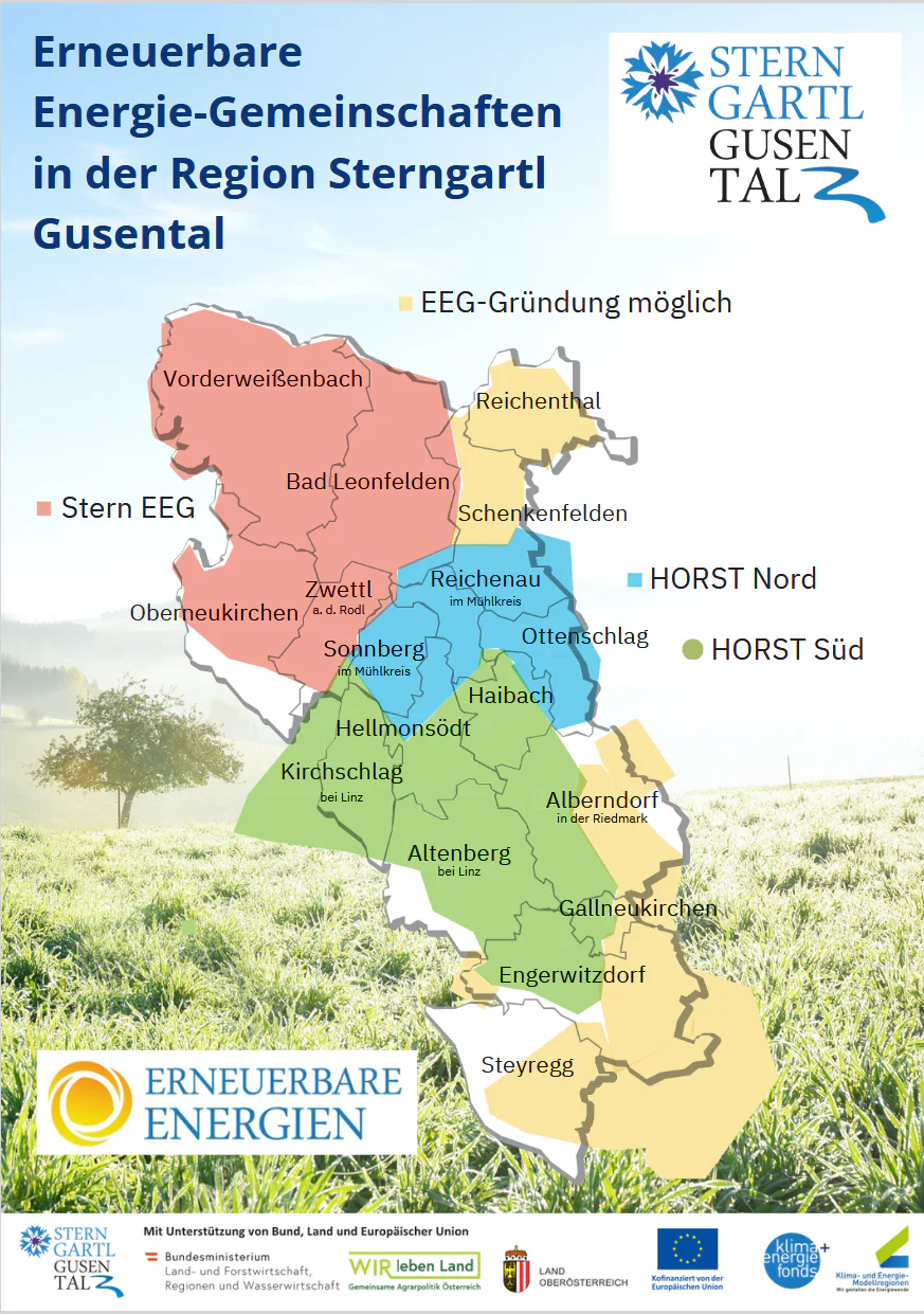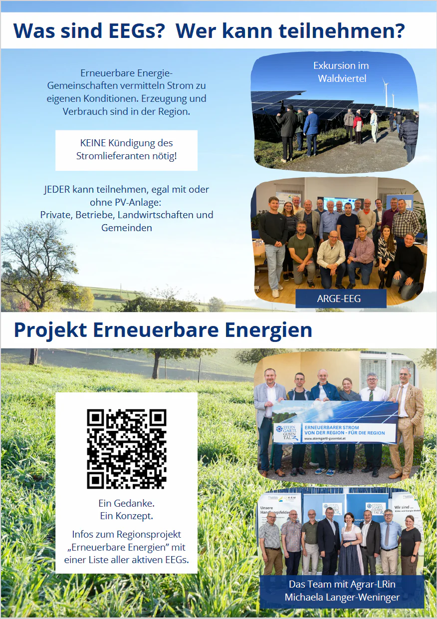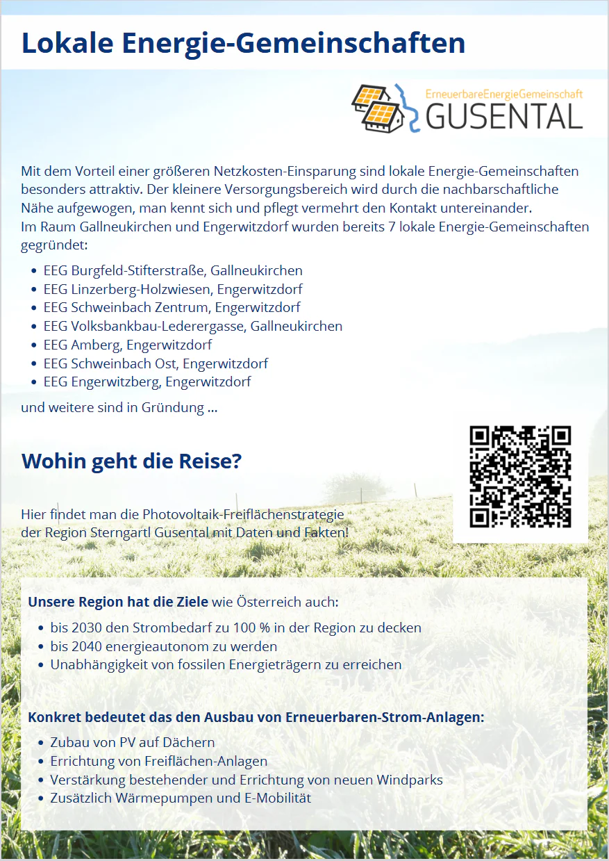 Weitere Informationen zu EEGs bzw. zu regionalen und lokalen Energiegemeinschaften in der Region Sterngartl Gusental können dem Folder entnommen werden.