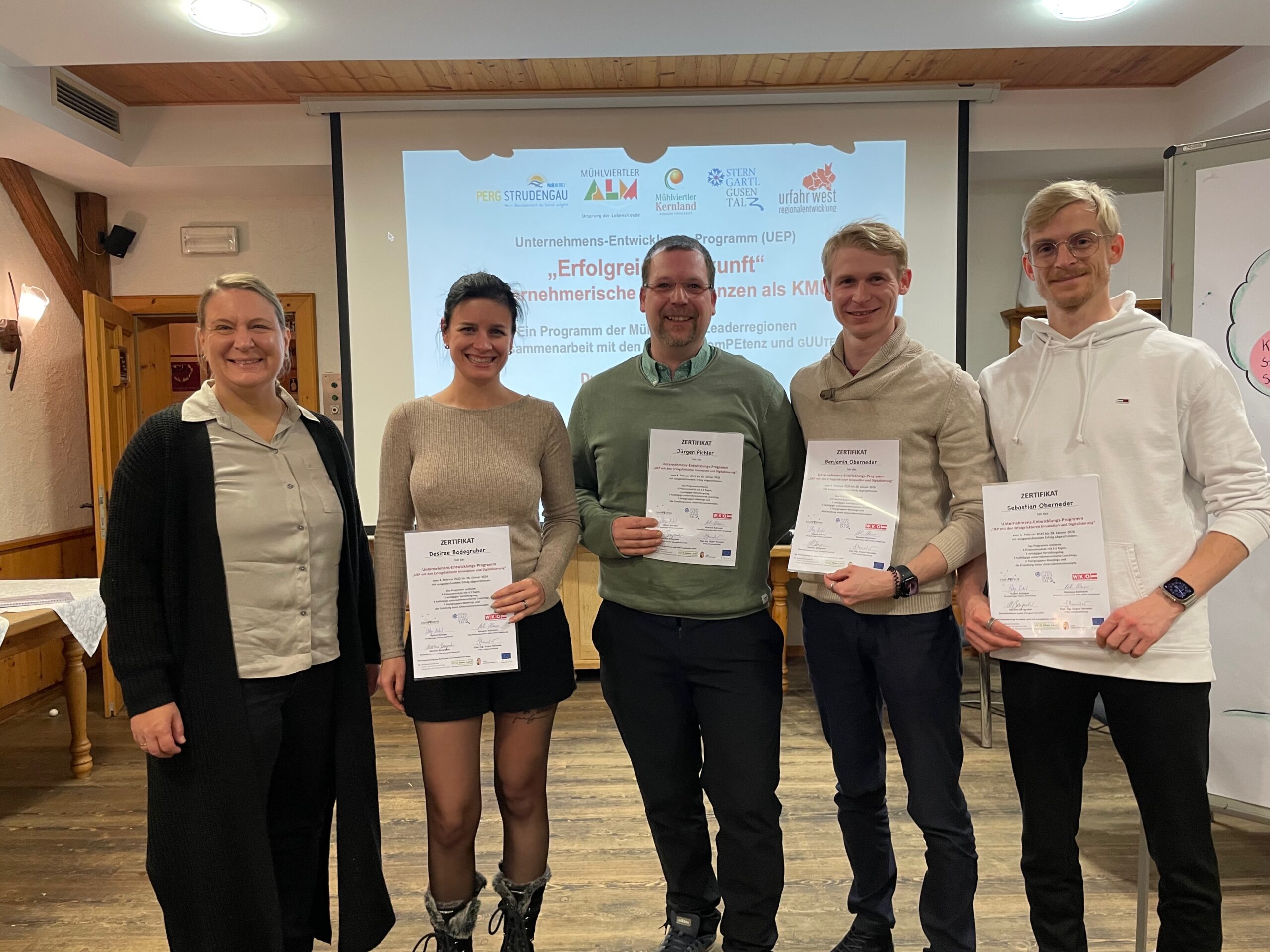 Die Stärkung ländlicher Unternehmen ist, neben der WKO Urfahr-Umgebung, auch den LEADER-Regionen ein großes Anliegen. Denn starke Betriebe sichern nicht nur die Versorgung, sondern Arbeitsplätze im ländlichen Raum. Sind sich die Unterstützer einig, gefördert wurde das Programm aus LEADER-Mitteln. Die Zertifikatsübergabe erfolgte durch die LEADER-Managerinnen Mag. Sigrid Gillmayr und Mag. Martina Birngruber sowie durch Klemens Ruttmann, Geschäftsstellenleiter der WKO-Bezirksstelle Urfahr-Umgebung.